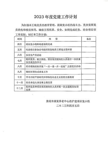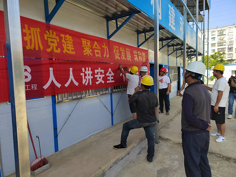 公司黨支部秉承“抓黨建就是抓生產(chǎn)力”的理念,全力推進(jìn)“黨建進(jìn)工地、支部建在項(xiàng)目上”標(biāo)桿創(chuàng)建活動(dòng),努力實(shí)現(xiàn)“生產(chǎn)一線有黨員、業(yè)務(wù)骨干是黨員、關(guān)鍵時(shí)刻看黨員”的工作目標(biāo)。于2023年4月1日成立婁底市康復(fù)養(yǎng)老中心改擴(kuò)建項(xiàng)目黨小組,現(xiàn)有正式黨員3名。項(xiàng)目部設(shè)有專門的黨建活動(dòng)場(chǎng)所,黨組織標(biāo)識(shí)牌、黨旗、入黨誓詞等全部設(shè)置在顯目位置。場(chǎng)外設(shè)置了專門的黨建宣傳欄。