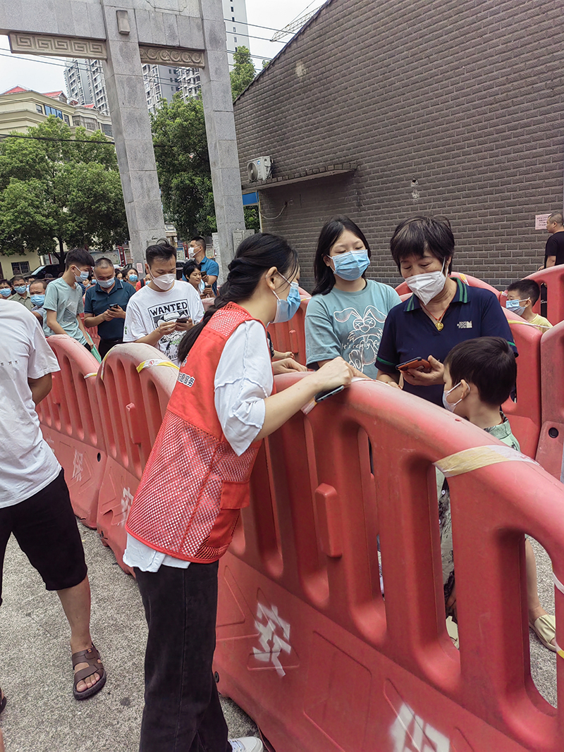 在核酸檢測現(xiàn)場,志愿者們與工作人員一同引導居民們按順序依次進行核酸檢測,認真核對好檢測人員的身份信息并進行錄入,做到規(guī)范、科學、快速有序開展登記和檢測工作,做好檢測人員的銜接,最大限度提高檢測工作效率,確保全民檢測工作有序開展。