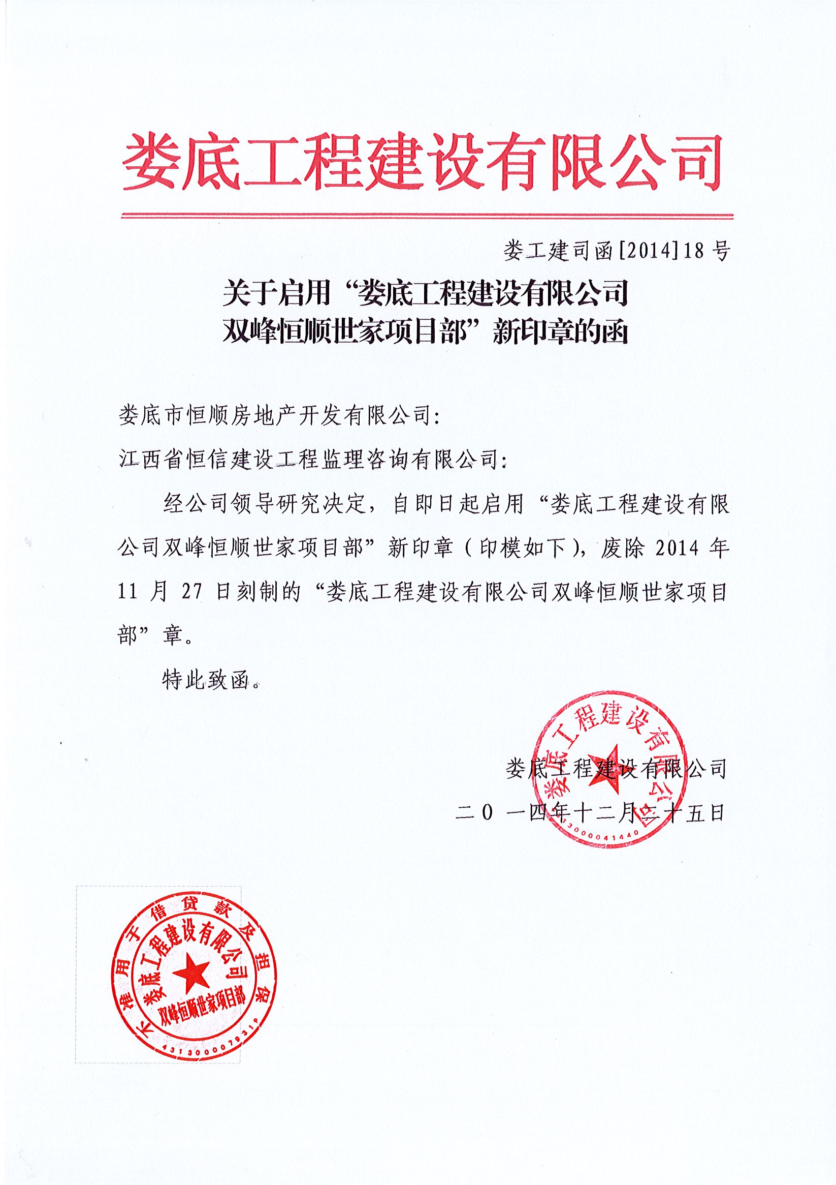 關(guān)于雙峰恒順世家項目啟用新印章的通告