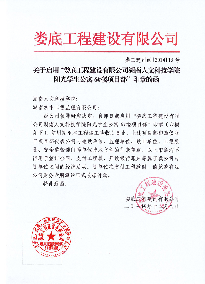 關(guān)于啟用人文科技學(xué)院陽光學(xué)生公寓6#樓項目部印章的通告