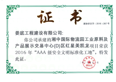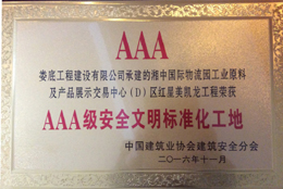 2016年11月23日,在安徽合肥舉行的中國建筑業(yè)協(xié)會安全分會2016年年會暨理事會上,我公司承建的湘中國際物流園工業(yè)原料及產品展示交易中心(D)區(qū)紅星美凱龍工程被評為AAA級安全文明標準化工地。這是我司繼2011年11月金谷建設小區(qū)8#、9#棟工程榮獲AAA級安全文明標準化工地后,又一次獲此殊榮。