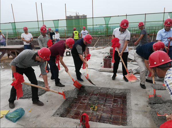 2018年5月23日,公司在江龍灘基地隆重舉行綜合樓主體封頂儀式。莊勝集團(tuán)有限公司總裁周建和先生,湖南湘中礦業(yè)集團(tuán)有限公司總裁楊克偉先生、副總裁劉璐先生親臨基地現(xiàn)場表示祝賀。公司高管在集團(tuán)副總裁兼婁底工程建設(shè)有限公司董事長張愛慧先生的帶領(lǐng)下,共同揮鏟,為大樓主體封頂添上最后一斗混凝土。