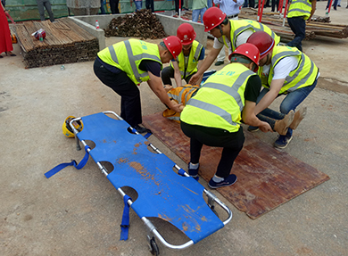 本次模擬情景是在項(xiàng)目東南側(cè)基坑墊層施工中,南側(cè)-5m處6名施工人員在平整土方時(shí)邊坡土體突然坍塌,工人張某被滑落土方掩埋。該路段土質(zhì)屬于回填土,邊坡上部可能有繼續(xù)坍塌的趨勢。項(xiàng)目經(jīng)理即刻啟動(dòng)了應(yīng)急救援預(yù)案。救援組所有成員攜帶救援工具趕到事故現(xiàn)場,通迅組人員立即向相關(guān)領(lǐng)導(dǎo)及主管部門報(bào)告事故情況并請(qǐng)求支援。