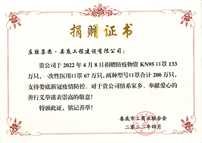 莊勝集團·婁底工程建設(shè)有限公司向婁底市捐贈200萬只防疫口罩